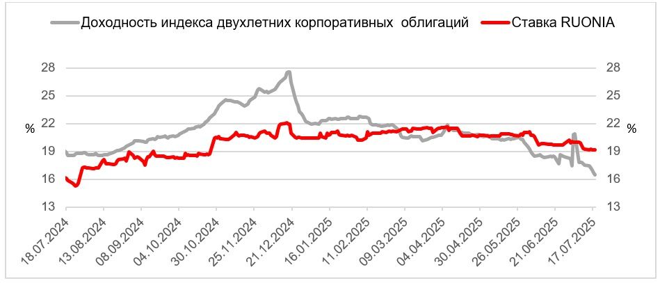 Как мы отмечали в записке от 04.10.2024 г. конъюнктура в сегменте рублевых флоатеров неразрывно связана с ситуацией в секторе их конкурентов ‒ классических облигаций с фиксированной ставкой купона. Они активно дорожают на ожиданиях по дальнейшему смягчению ДКП с соответствующим снижением доходностей. На графике ниже видно, что примерно с начала июня этого года (т.е. как раз с начала ценового отскока флоатеров) доходность индекса двухлетних облигаций с фиксированными купонами стала устойчиво ниже ставки денежного рынка RUONIA, которая наряду с ключевой ставкой ЦБ является ориентиром для определения купонов (а, следовательно, и денежного потока) по флоатерам. Ситуация усугубляется тем, что, например, все корпоративные флоатеры размещаются с определённой премией (как минимум 1 п.п.) к референтной ставке. Возникший дисбаланс доходностей и привел к росту стоимости бумаг с переменной ставкой купона.