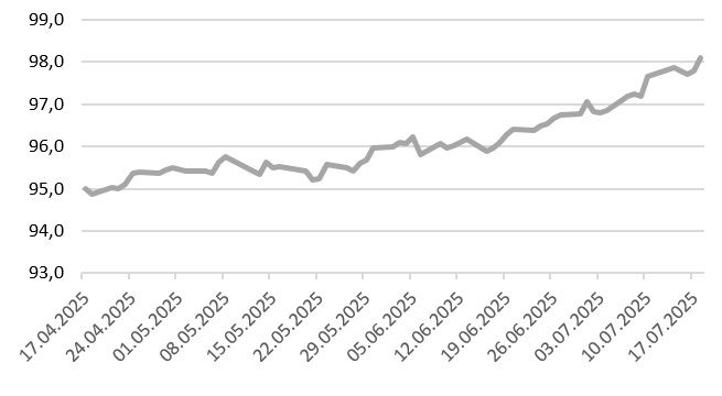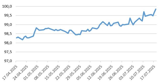 Растут в цене и бумаги, находящиеся в нашем покрытии (см. график ниже). Как правило, чем ближе дата погашения облигации, тем сильнее ее цена стремится к номиналу. Поэтому для минимизации ценовой волатильности можно ориентироваться на сравнительно короткие флоатеры: ОФЗ-ПК серии 29014 (погашение: март 2026), АЛРОСА, 001Р-02 (апрель 2026) и Россельхозбанк, БО-02-002Р (май 2026). Отметим, что снижение «ключа» и RUONIA транслируется в купоны флоатеров с определённой задержкой. Мы ожидаем, что в сочетании с кредитными премиями это обеспечит в ближайшие месяцы конкурентоспособный уровень денежного потока по данному классу бумаг с возможностью его реинвестирования в условиях остающихся двузначными процентных ставок.