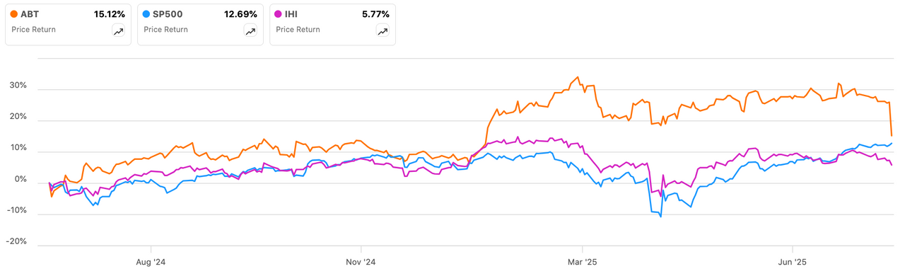 За последние 12 месяцев акции Abbott показывают динамику с опережением отраслевого ETF (IHI) и американского индекса широкого рынка S&P 500 — прибавляют 15%.