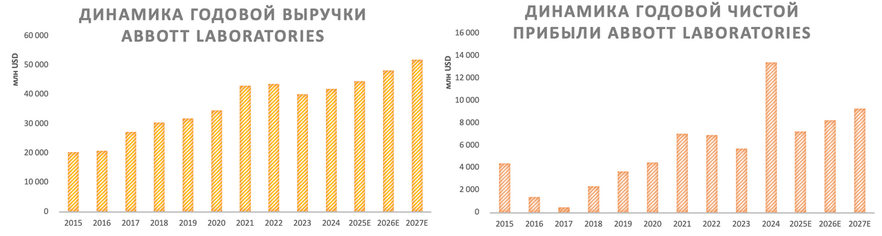 В 2025 году мы ожидаем положительной динамики ключевых показателей Abbott — рост прогнозируется по выручке, EBITDA и скорректированной чистой прибыли на акцию. У компании нет и не предвидится проблем с долговой нагрузкой.
