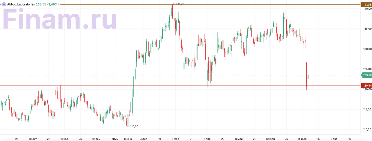 Компания обозначила прогноз по скорректированной прибыли на акцию на 2025 год в диапазоне $5,10–5,20 (предыдущий прогноз — $5,05–5,25) и ожидает роста выручки в текущем году (без учета ковидного сегмента) на уровне 7,5–8,0% (предыдущий прогноз — 7,5–8,5%). Компания уточнила, что негативное влияние тарифов в текущем году составит всего около $200 млн — меньше, чем ожидалось. Рынок негативно отреагировал на корректировку прогнозов по выручке. Наш взгляд, это преувеличенная реакция и после однодневной просадки акции Abbott стали выглядеть еще более привлекательными, будучи на локальном дне.