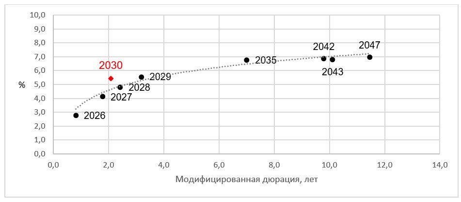 Как выпуск с амортизацией, Россия, ОВОЗ РФ 2030 выплачивает часть номинала вместе с купоном. В результате держатель быстрее получает назад «тело» займа, при этом купонный платеж по бумаге постепенно сокращается. Следствием амортизации является и то, что дюрация облигации (период до полного возврата инвестиций) значительно меньше срока до ее погашения. Так, дюрация Россия, ОВОЗ РФ 2030 сейчас составляет 2,2 года, притом что до ее погашения (31.03.2030) остается вдвое больше — 4,7 года.