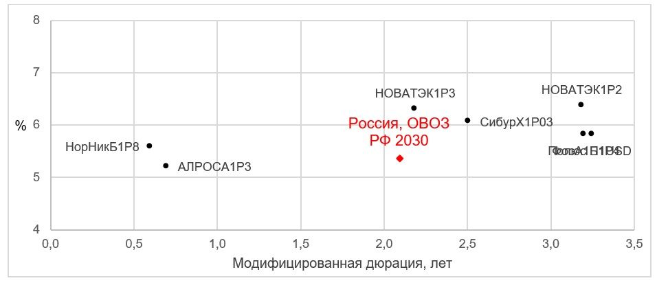 Как видно на графике ниже, наличие данной премии позволяет Россия, ОВОЗ РФ 2030 торговаться практически на уровне надежных корпоративных облигаций сравнительно малой лотности, несмотря на суверенный риск.