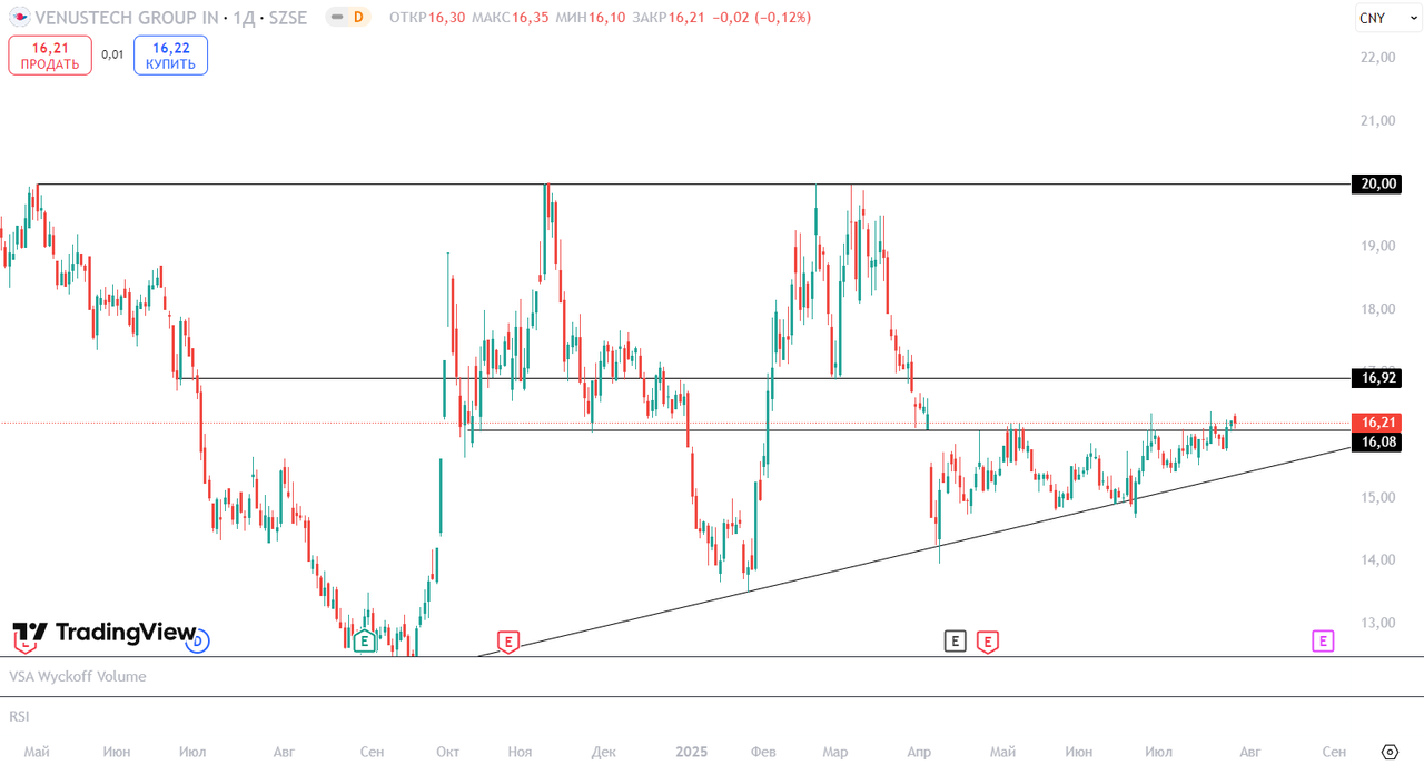 Акции движутся выше локального восходящего тренда. Они пробили уровень сопротивления 16,08 юаня. Ближайшим уровнем сопротивления будет 16,92 юаня. При пробитии этого уровня возможен рост до 20 юаней.