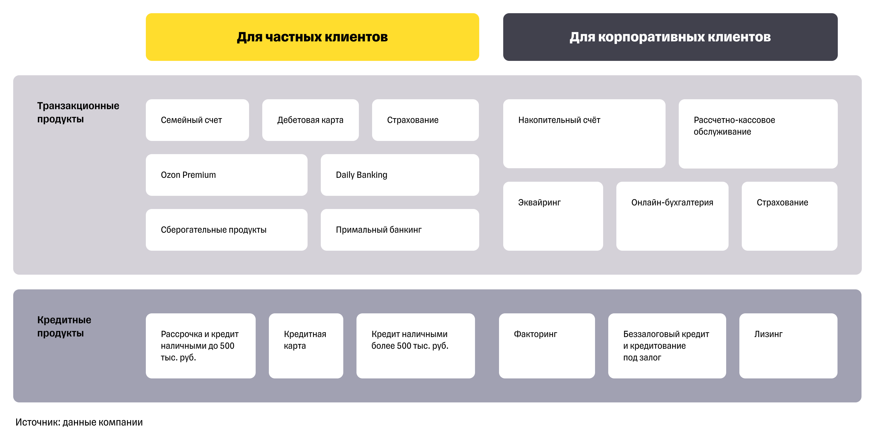Если изначально Ozon Банк ориентировался больше на селлеров, предоставляя им услуги, направленные на упрощение и оптимизацию их работы, то сейчас финтех-сегмент Ozon предоставляет широкий спектр услуг и для частных клиентов.