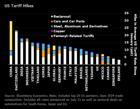 Президент США своим указом установил импортные пошлины в размере 10-41% для 69 стран, они вступят в силу с 7 августа. Наконец в конфигурации основных тарифов, вводимых администрацией Д. Трампа для большинства стран мира, наступила какая-то определенность – хотя, скорее всего, условия еще не раз изменятся в течение его президентского срока. По оценкам Bloomberg, средняя ставка таможенных пошлин в США вырастет до 15,2% - что немного выше, чем 13,3% до 1 августа и значительно выше 2,3% в 2024 году. По оценке Capital Economics, средний тариф повысится до 18%. В любом случае, это максимальный уровень тарифов с 30-х гг прошлого века.