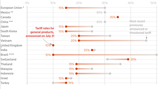 Базовый импортный тариф США для большинства государств, не указанных в приложении, останется на том же уровне, который был введен 2 апреля — 10%. Как отмечает CNN, эта ставка будет применяться только к странам, в которые США экспортируют больше, чем импортируют. Минимальная базовая таможенная пошлина в 15% будет применяться к странам, с которыми у США есть небольшой торговый дефицит (либо заключены соответствующие индивидуальные торговые соглашения). В частности, государства ЕС, Япония, Южная Корея. Ставка выше 15% вводится в отношении государств, которые не заключили торговое соглашение с Соединенными Штатами, либо с которыми сложился наиболее крупный торговый дефицит. Наиболее высокие значения тарифов установлены для Сирии (41%), Лаоса, Мьянмы (40%), Швейцарии (39%), Ирака, Канады, Сербии (35%), Алжира, Боснии и Герцеговины, Ливии и ЮАР (30%), Индии (25%). Для Бразилии тариф был введен на уровне 10% и повышен до 50% по политическим причинам, но при этом сделано много отраслевых исключений.