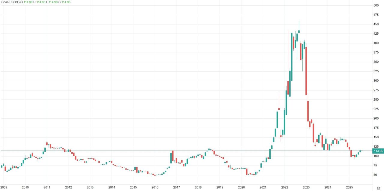 В 2025 г. предложение должно составить порядка 9,2 млрд. т., что при неизменном спросе означает, что мировой рынок угля вновь ожидается профицитным. За 1П 2025 г. Китай нарастил производство на 6% г/г. За полный год ожидается, что производство вырастет на 3%, достигнув отметки 4,8 млрд. т. Производство в Индии может составить 1,11 млрд. т. (рост на 3%).