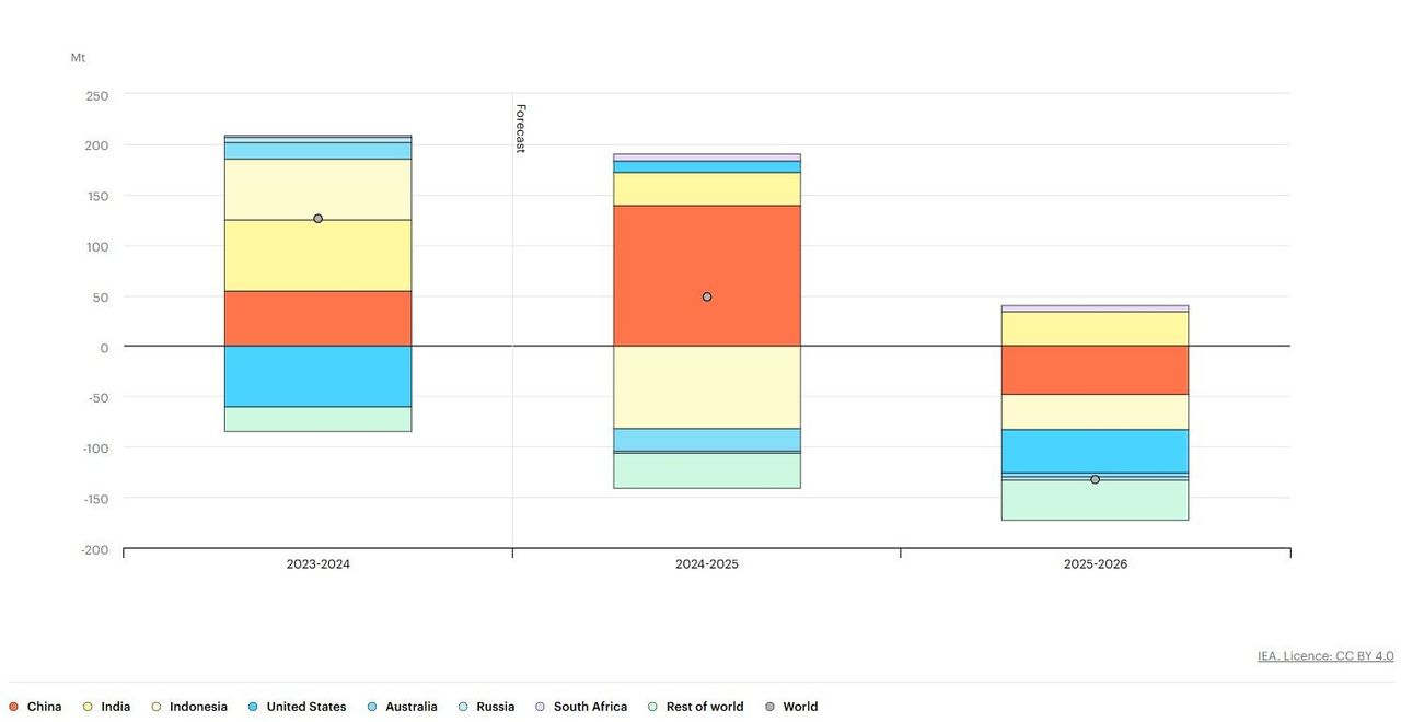 В 2026 г. МЭА продолжает ожидать плато на рынке. Спрос, по мнению агентства, должен составить порядка 8,78 млрд.т. В лидерах спроса останется Китай с ростом почти на 1%. Спрос в Индии может составить порядка 2,5%. Из других стран МЭА ждёт что спрос увеличится во Вьетнаме и Индонезии. В Японии и Корее спрос сократится на 8% и 4%, соответственно.