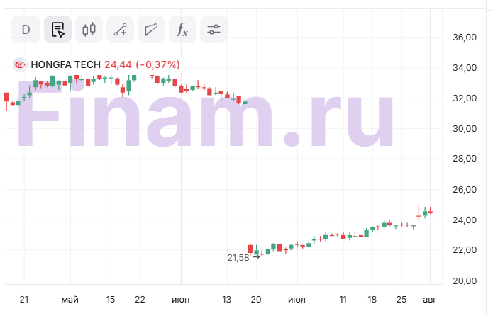 Акции Hongfa обладают потенциалом роста на 40,1%. Анализ стоимости по мультипликаторам P/E, EV/S, EV/EBITDA 2025E относительно аналогов предполагает таргет CNY 34,36.