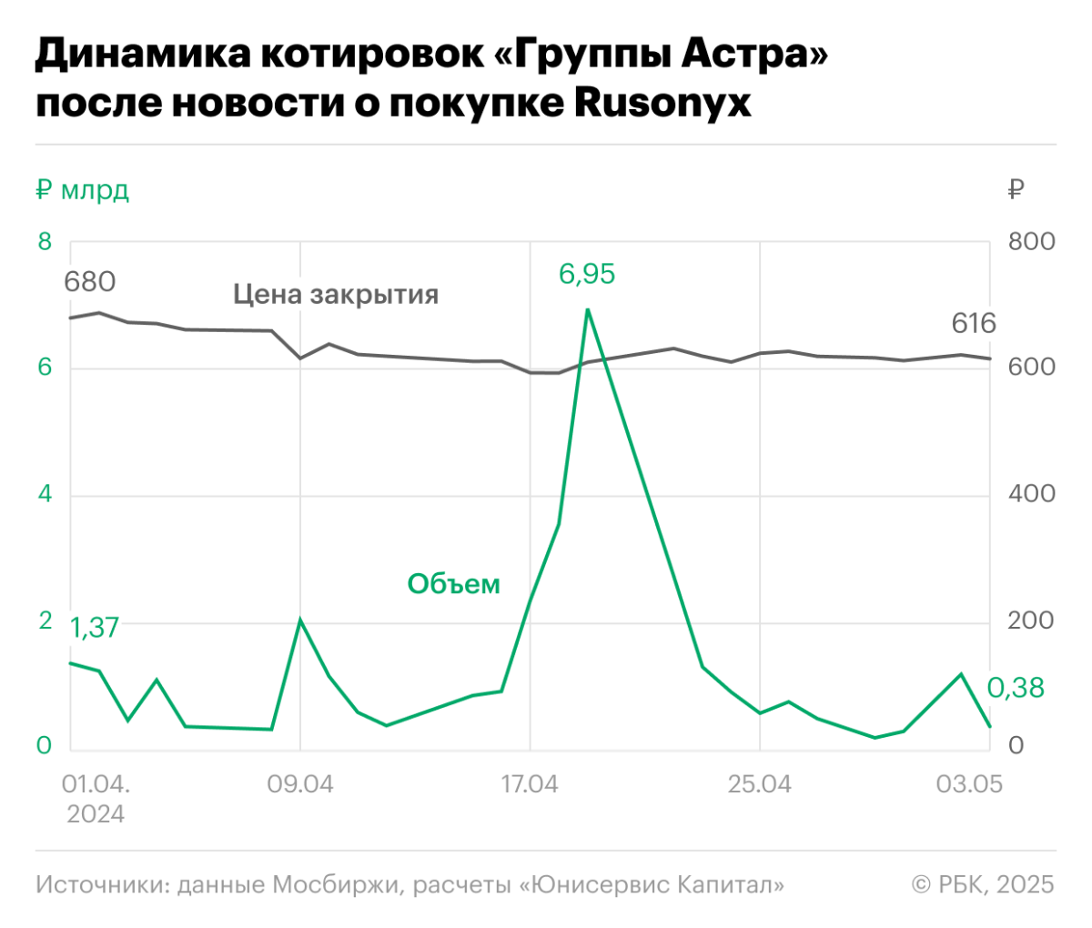 Динамика котировок «Группы Астра» после новости о покупке Rusonyx