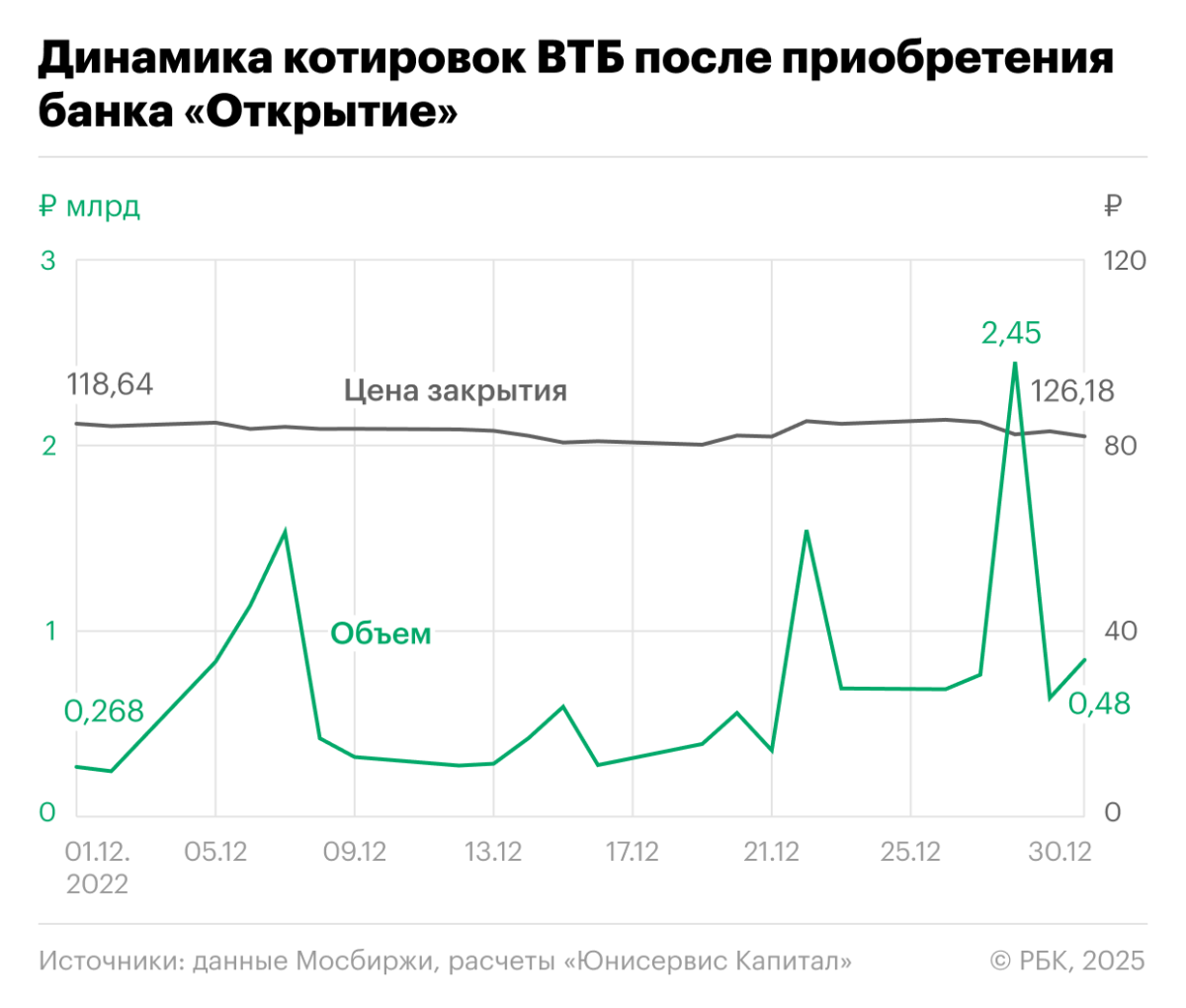 Начнем с резонансной сделки 2022 года: приобретения ВТБ банка «Открытие» у Банка России за ₽340 млрд. На новость о покупке 22 декабря акции ВТБ отреагировали ростом на 4%, достигнув ₽85,2, а объемы торгов в первый день выросли в 3,3 раза. Ожидания синергетического эффекта от объединения банков — укрупнение капитала, снижение издержек, повышение эффективности — подогревали интерес инвесторов, а эксперты прогнозировали рост акций ВТБ на 30% по итогам 2023 года.