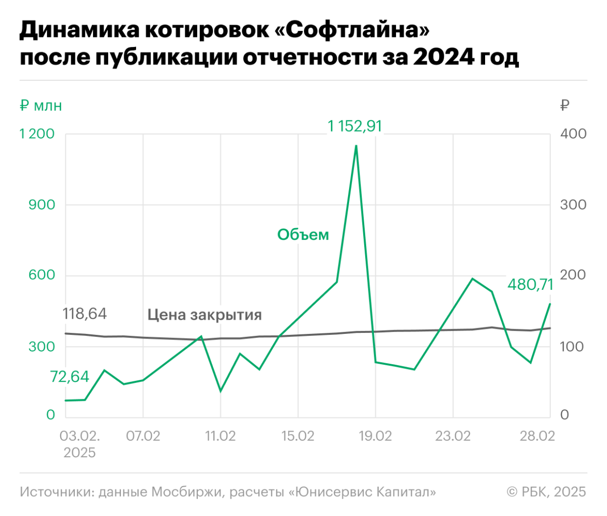 В день раскрытия информации объем торгов увеличился вдвое и составил ₽1,15 млрд, акции выросли на 2%, в течение месяца котировки дошли до границы ₽127 за акцию (+8% к началу месяца). Инвесторы активно отреагировали на хорошие результаты работы ПАО «Софтлайн».
