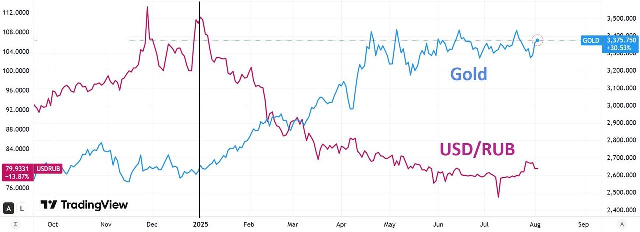 В этой связи тот рост цен на золото, который мы видели в первые месяцы 2025 года, полностью нивелирован усилением курса рубля за этот период. Ниже представлен график, на котором можно видеть это: золото выросло в цене с начала 2025 года на 28%, а курс рубля к доллару при этом укрепился на 27%.
