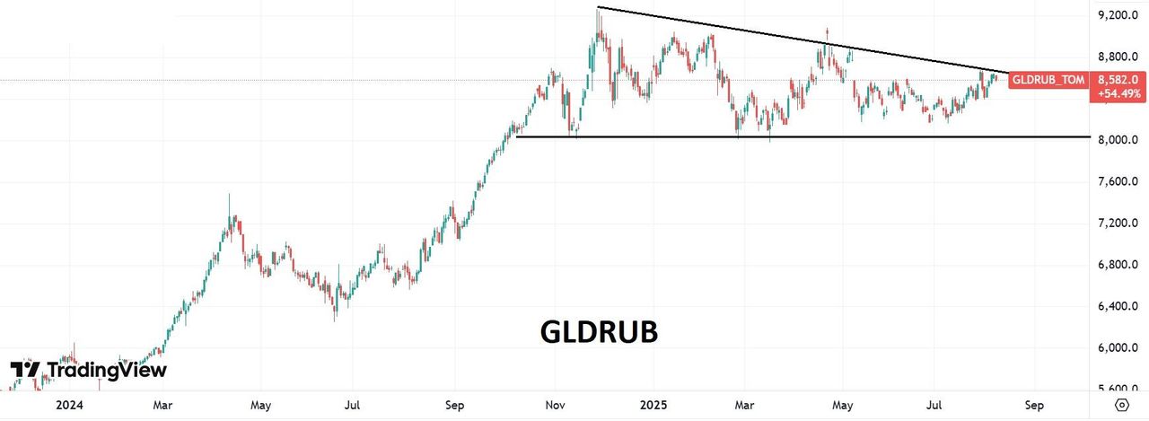 В ситуации минимального возможного подъема цен на золото при сохранении относительно стабильного курса рубля (ослабление в рамках инфляции) мы получаем вероятный подъем стоимости контрактов GLDRUB около 8%. В абсолютном выражении это предполагает подъем котировок в район 9250 руб. (здесь ранее был ценовой максимум 2024 года).