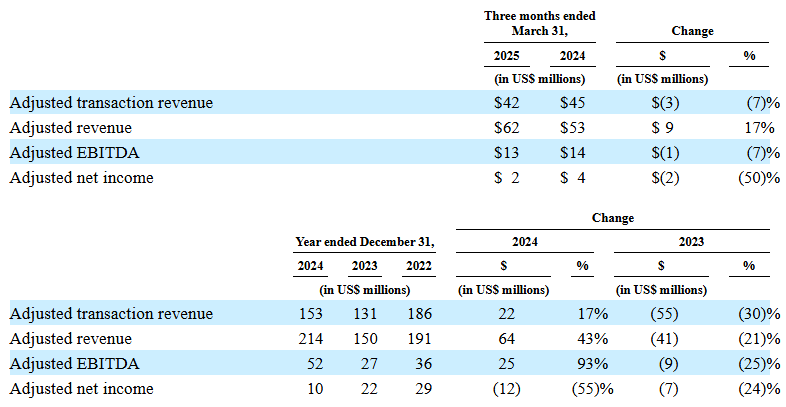 Скорректированная выручка (без доходов со сторонних площадок) выросла в 2024 году на 43% до $214 млн, также за счет консолидации CCData. Скорр. EBITDA, которая учитывает только доходы от операционного бизнеса и исключает переоценки активов, выросла на 93% до $ 52 млн. Скорр. чистая прибыль составила $10 млн, снизившись на 55% (г/г) из-за роста процентных расходов компании.