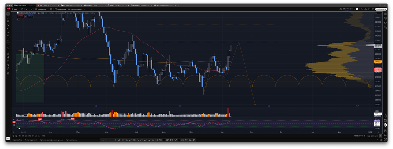 Первая цель по индексу – это 3050-3080 пунктов. По фьючерсу – 308 000 рублей.