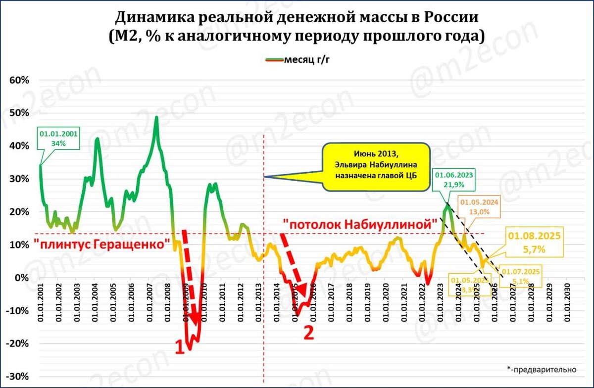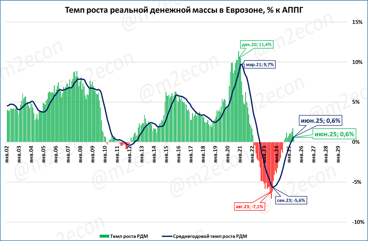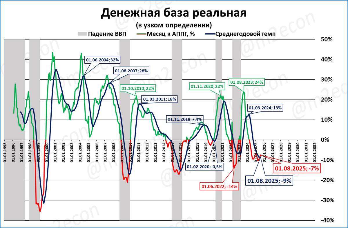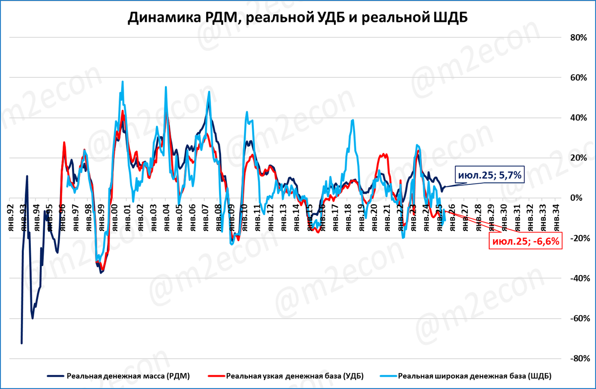 На 1 августа 2025 в реальном выражении денежная масса выросла на 5,7% за год. Текущий темп роста РДМ соответствует стагнационному росту ВВП на 1,8%.