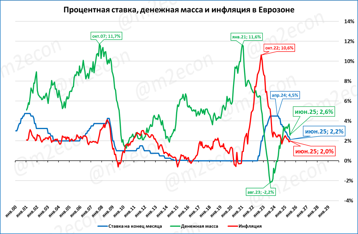 Денежная масса в Еврозоне за июнь замедлила свой рост с 3,7% в мае до 2,6% в июне. ВВП в Еврозоне вырос во 2 квартале 2025 года на 1,4%. К концу года МВФ ожидает рост ВВП на 1,0%.