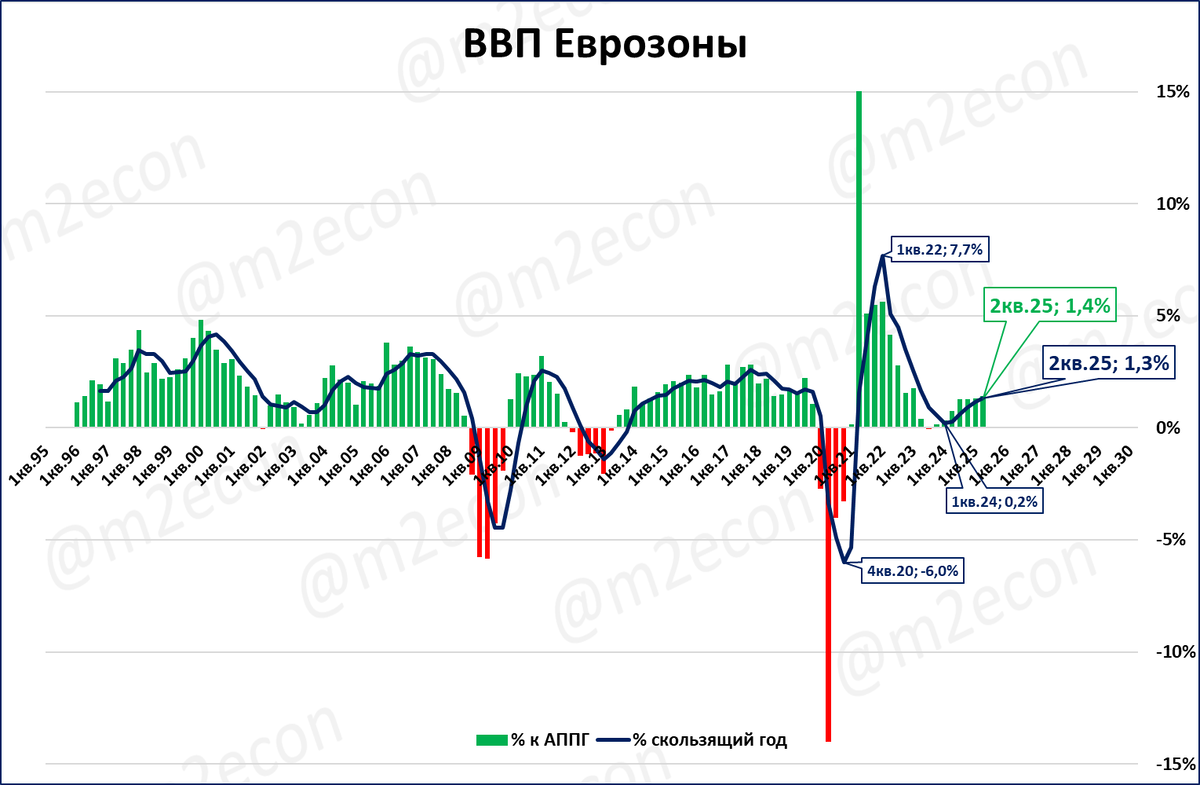 ВВП в Еврозоне вырос во 2 квартале 2025 года на 1,4%.