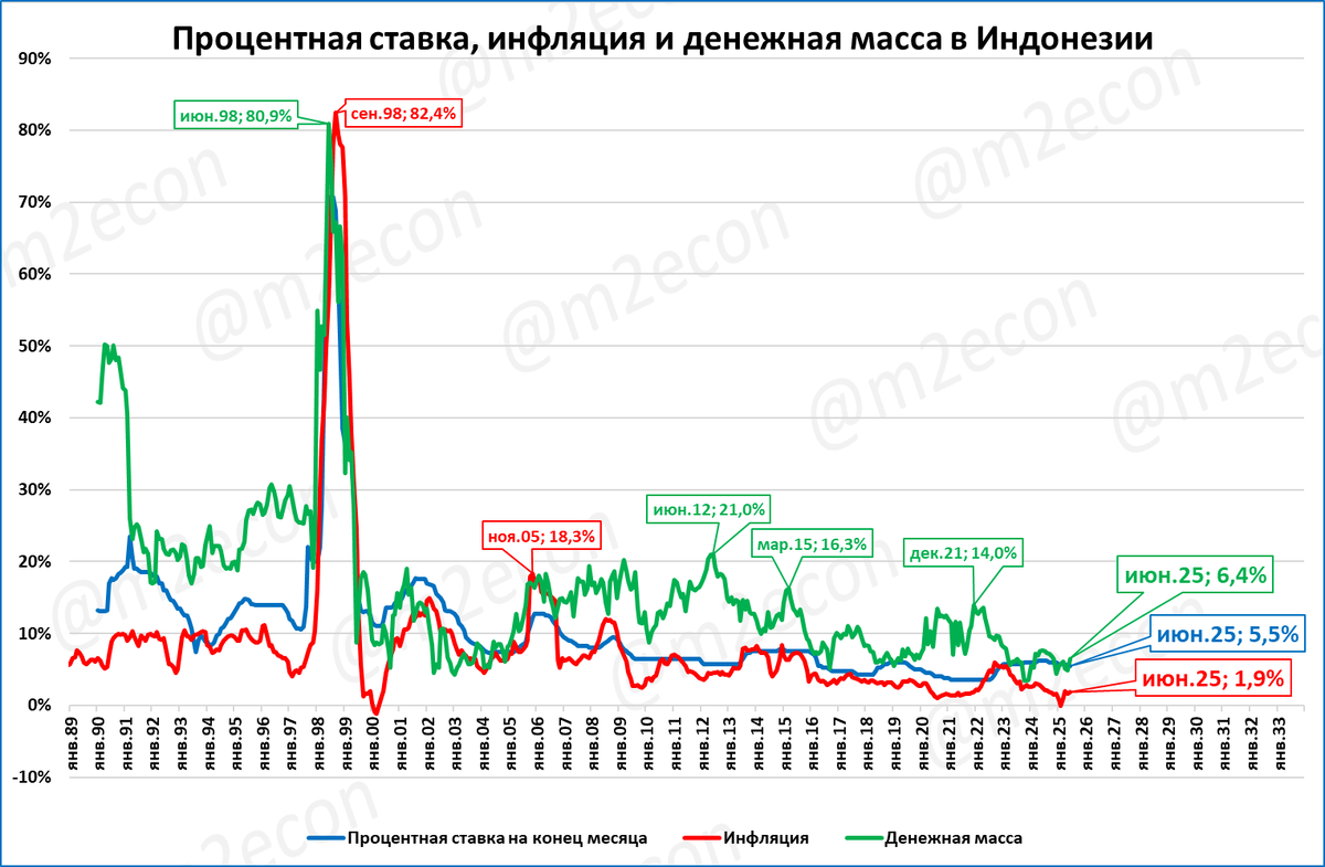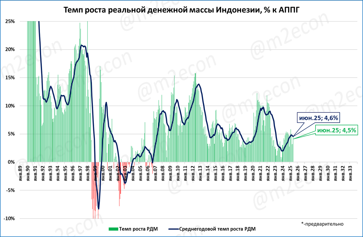 Денежная масса в Индонезии по итогам июня выросла на 6,4% годовых. В реальном выражении: + 4,5%.
