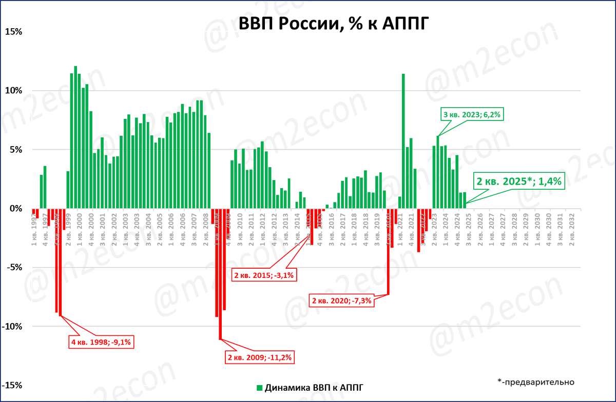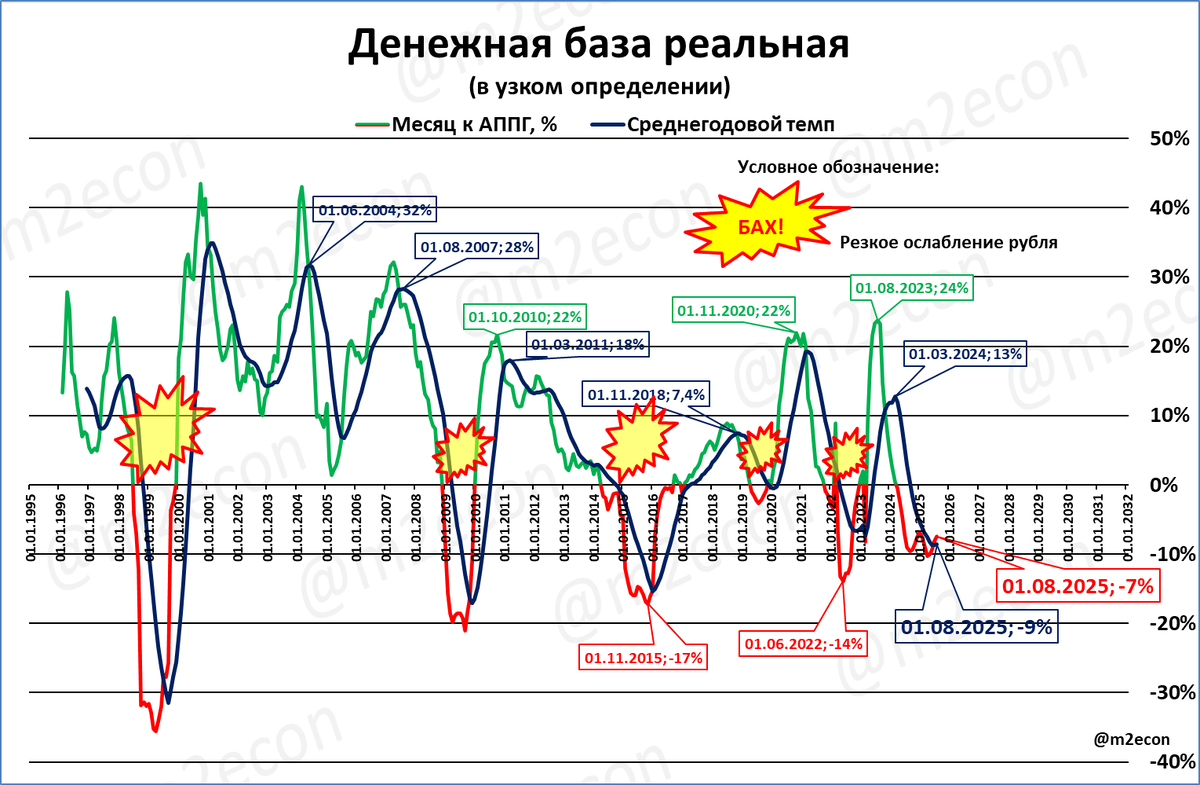 Как и «бахи» (см. выше), случаи сжатия реальной УДБ совпадали по времени с падениями ВВП. Но в 2024 году падения ВВП не случилось, как и резкого ослабления рубля.