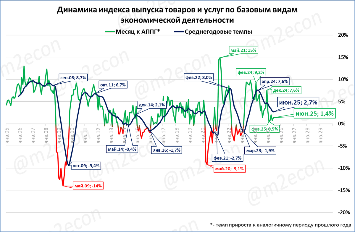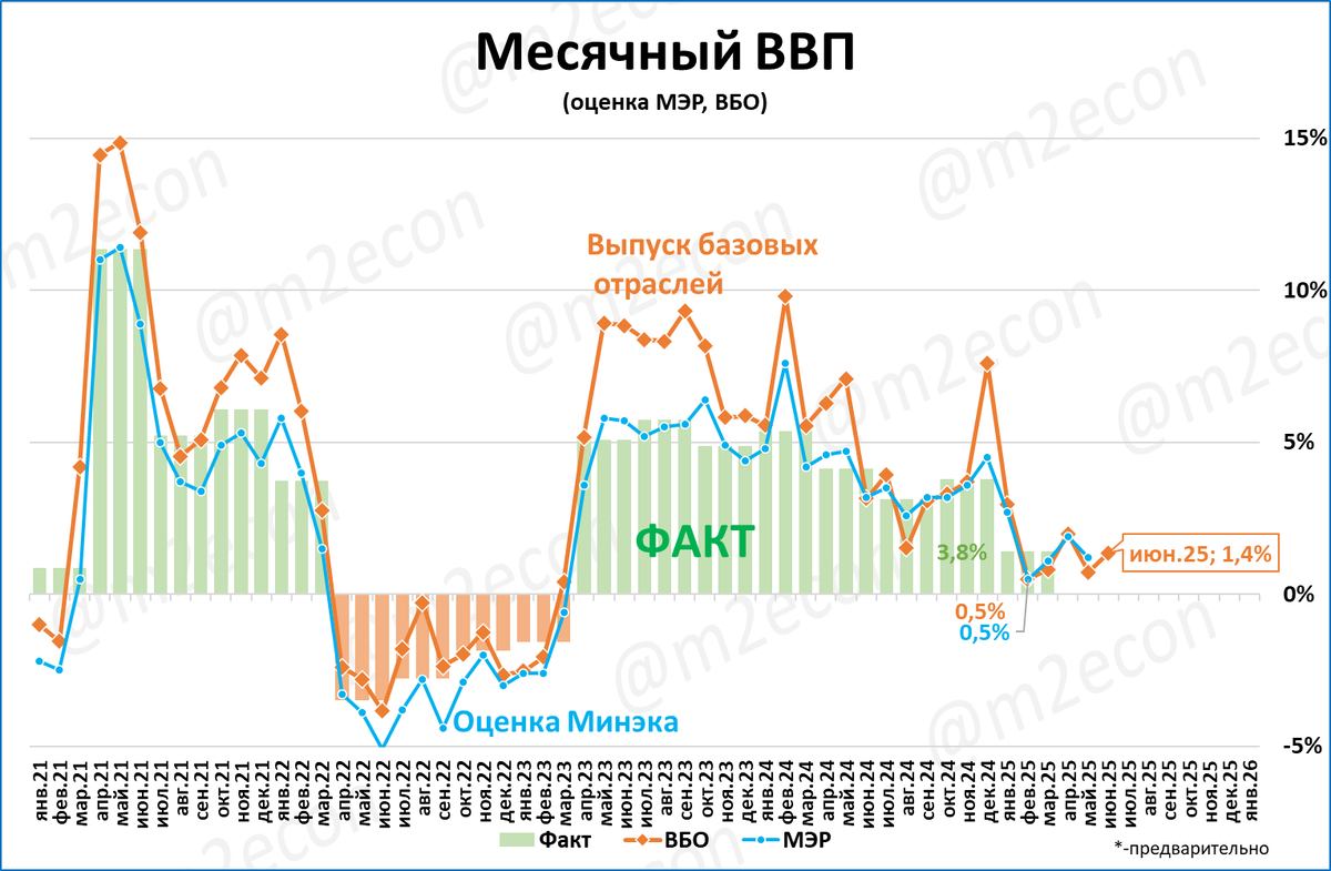 Традиционно после выхода данных по ВБО (вышли в пятницу, 8 августа, см. выше) Минэкономразвития даёт свою оценку роста ВВП за соответствующий месяц и период с начала года.