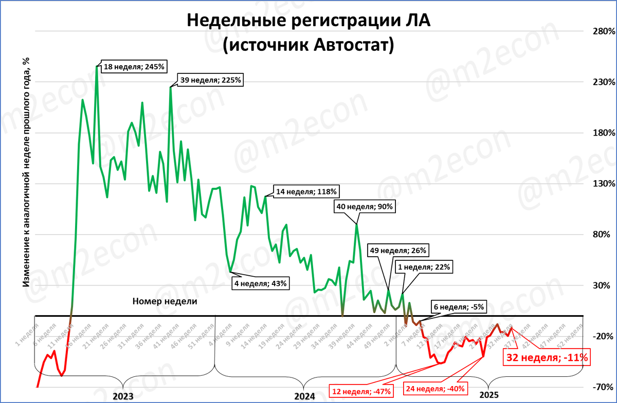 Это -11% к 32 неделе прошлого года.