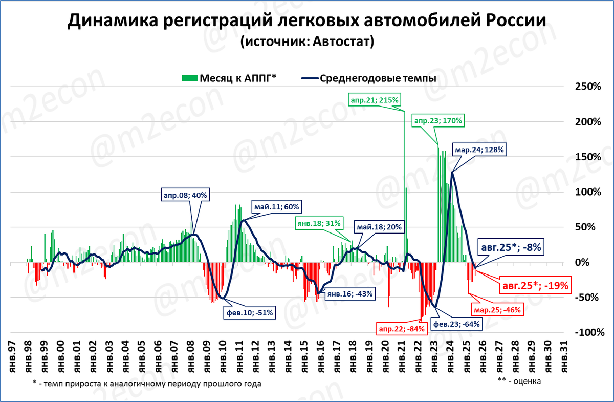Это ниже на 7%, чем в аналогичный период прошлого года (против -8% месяц назад). Падение замедляется, что видно на нашем традиционном графике с «бахом».