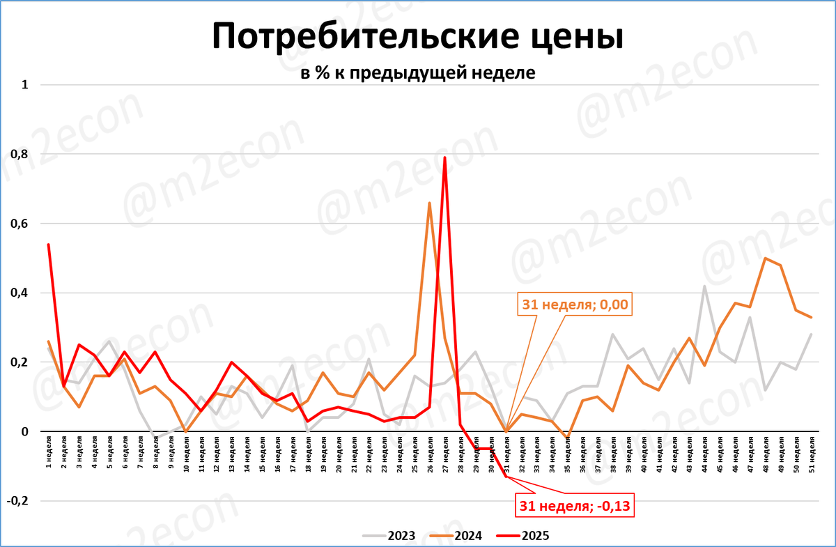 Инфляция на 31-й неделе прошлого года была нулевой. Казалось, трудно быть ниже. Трудно, но можно: на 31 неделе этого года цены снизились на 0,13%