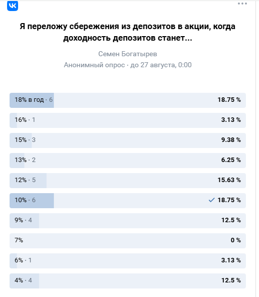 В связи с понижением ставки ЦБ для инвесторов стал актуальным вопрос, до какого уровня доходности они будут держать деньги на депозитах. Проведённый опрос показал следующее: