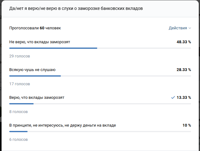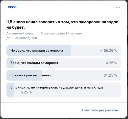 В связи с новым вбросом информации про слухи о заморозке вкладов, было выступление спикеров ЦБ. По этому поводу был проведен новый опрос по отношению к этой проблеме финансистов. Вот его результаты: