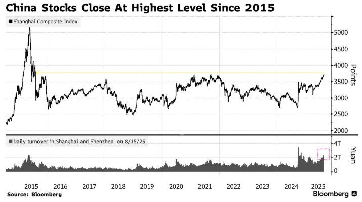 Композитный индекс Шанхайской фондовой биржи закрылся на самом высоком уровне за десятилетие, подскочив на 0,9% до 3728 в понедельник. Рост отражает растущий оптимизм среди мелких инвесторов, которые переходят из облигаций в акции, а оборот на материковых биржах в понедельник достиг второго по величине уровня за всю историю.