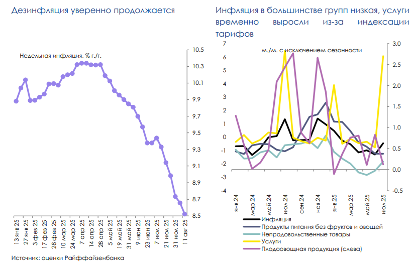 Судя по месячным данным за июль, в большинстве групп инфляция месяц к месяцу с исключением сезонности уже достаточно низкая. Так, например, цены на непродовольственные товары уже растут темпами ниже цели ЦБ (0,19% месяц к месяцу, или 2,3% год к году в аннуализированном выражении), продукты питания без учета фруктов и овощей (в которых наблюдается дефляция месяц к месяцу с исключением сезонности) – на 0,37% месяц к месяцу (4,6% год к году в аннуализированном выражении). Единственная категория, показавшая временный всплеск – услуги, причем только из-за индексации тарифов.