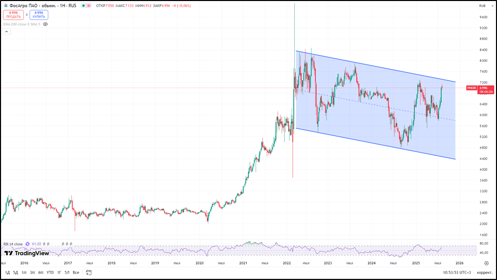 Последние три года акции ФосАгро торгуются в слабо нисходящем тренде. С начала 2025 года динамика +10%.