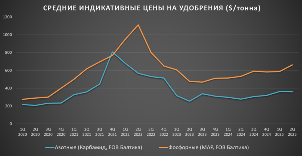 Средние цены на удобрения в 2Q 2025 (FOB Балтика) значительно выше г/г:
