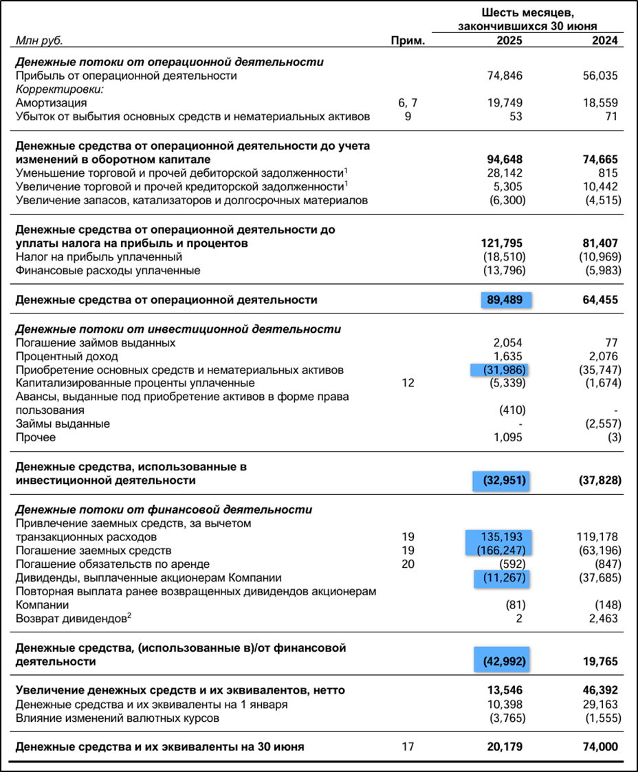 Инвестиционный: -33 млрд (-13% г/г). Капитальные затраты 32 млрд.