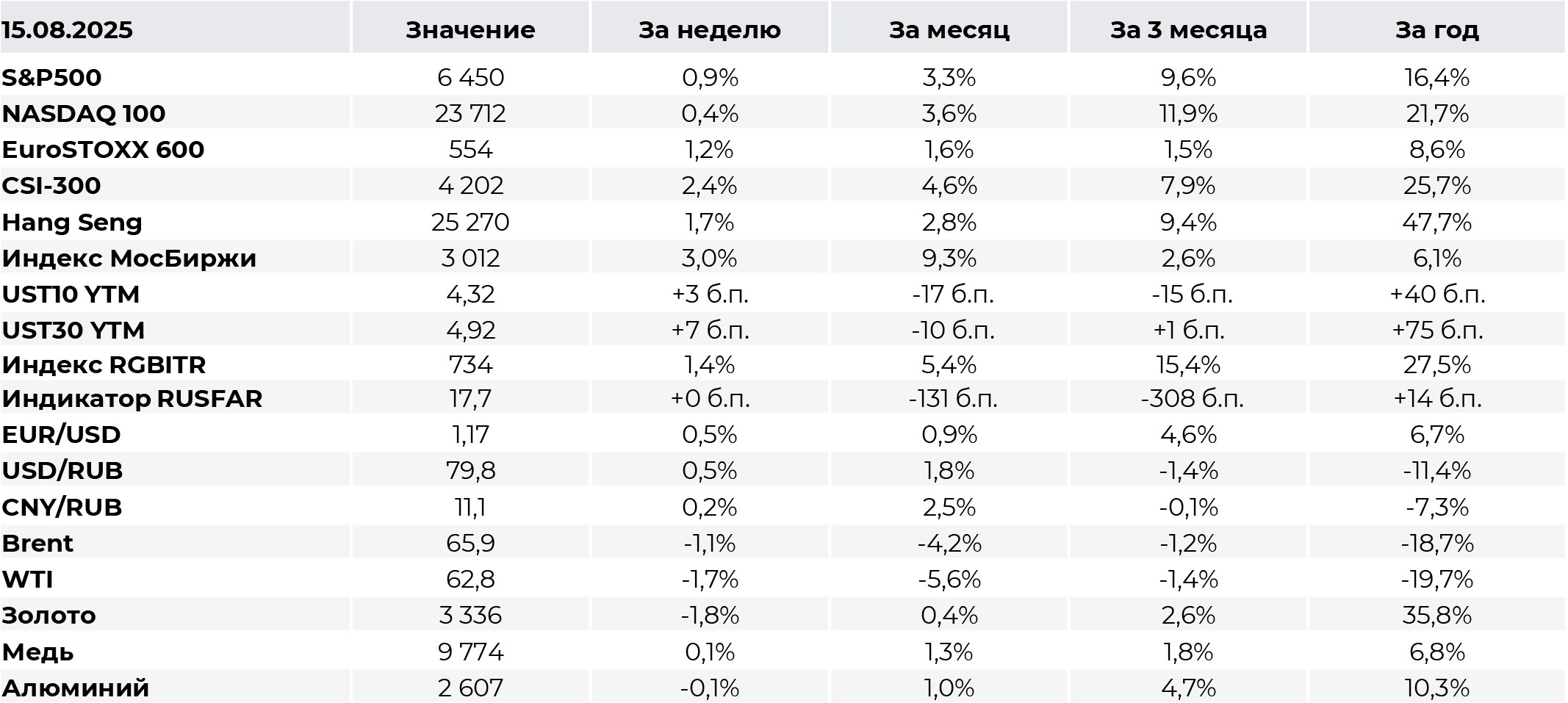 Нефтяные котировки ожидаемо скорректировались вниз (-1,1% в цене Brent, −1,7% по WTI) после встречи Владимира Путина и Дональда Трампа на Аляске. Хотя переговоры не привели к существенному прогрессу в урегулировании конфликта РФ и Украины, тон коммуникации двух президентов и отсутствие негативных последствий ослабили опасения ужесточения санкций в отношении России и ее торговых партнеров, в том числе Китая. Фокус внимания смещается на результаты следующих запланированных встреч и возможности заключения торговой сделки с Индией об отмене дополнительных пошлин, введенных для страны из-за закупок российской нефти и вступающих в силу с 27 августа.