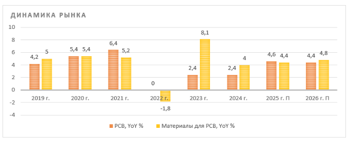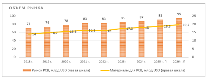 Мировой рынок печатных плат (PCB) в 2024 г. оценивается примерно в объеме $86–88 млрд, рост к 2023 г. мог составить порядка 3,0–3,5%. В 2025 г. ожидается рост рынка до $91 млрд. Ожидаемый среднегодовой рост (CAGR) до 2027 г. — 4–5%; мотор роста — автоэлектроника, 5G, дата-центры.