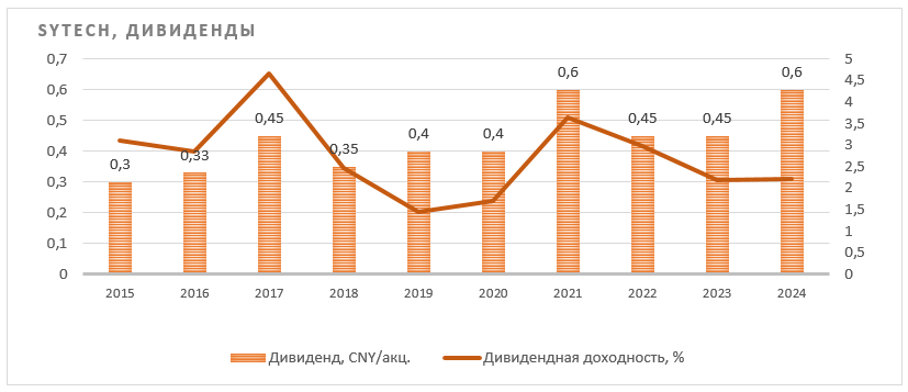 Дивидендная доходность акций Shengyi Technology невысокая, но достаточно стабильная, в среднем 2,0–2,5%. Дивиденды за 2024 г. составили 0,60 юаня на акцию с доходностью 2,2%.