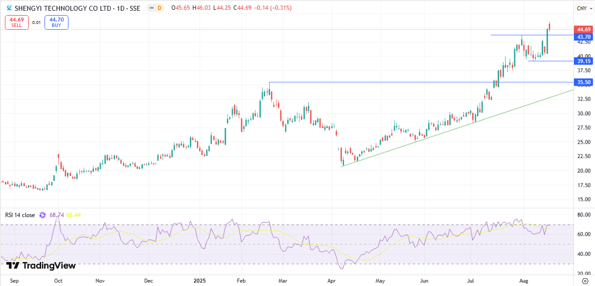 На дневном графике котировки акций Shengyi Technology находятся в восходящем тренде. Ускорение роста совпадает с публикацией сильных отчетов. После выхода последнего акции компании обновили максимум. Однако положение RSI показывает на вероятную дивергенцию в зоне перекупленности, что может быть признаком увеличивающегося сопротивления при продолжении роста. Уровни поддержки расположены в районе CNY 39 и CNY 35,5 за акцию.