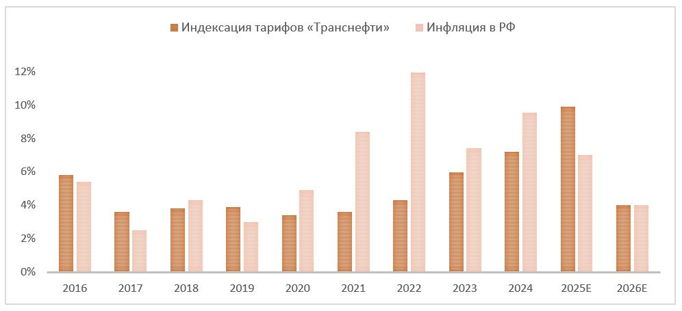 Выручка «Транснефти» в первую очередь зависит от двух основных показателей — уровня тарифа на транспортировку и объема транспортировки нефти. На данный момент тарифы на транспортировку ежегодно индексируются в объеме 99,9% от прогнозируемой инфляции. Индексация тарифов в начале текущего года составила 9,9% — высокое значение, которое должно было компенсировать увеличение ставки налога на прибыль до 40%. В следующем году ожидаем более скромной индексации в диапазоне 4–5%, так как на фоне текущей жесткой ДКП ЦБ и МЭР ожидают приближения инфляции к цели в 4% в 2026 году.