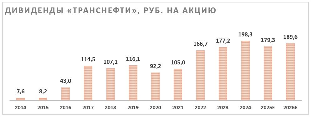 «Транснефть» выплачивает 50% скорректированной прибыли в виде дивидендов. По итогам текущего года ожидаем выплаты в размере 179,3 руб. на акцию, что соответствует 13,5% доходности — высокое значение для сектора.