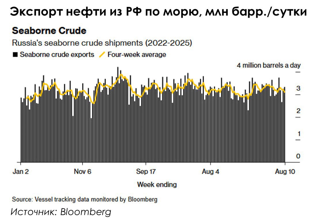 По данным Bloomberg, до 10 августа экспорт нефти из России по морю оставался стабильным. Средний объем поставок снизился незначительно, до 3,1 мбс за четыре недели до указанной даты по сравнению с 3,2 мбс в июле. При этом на неделе до 10 августа экспорт вырос до 3,3 мбс.