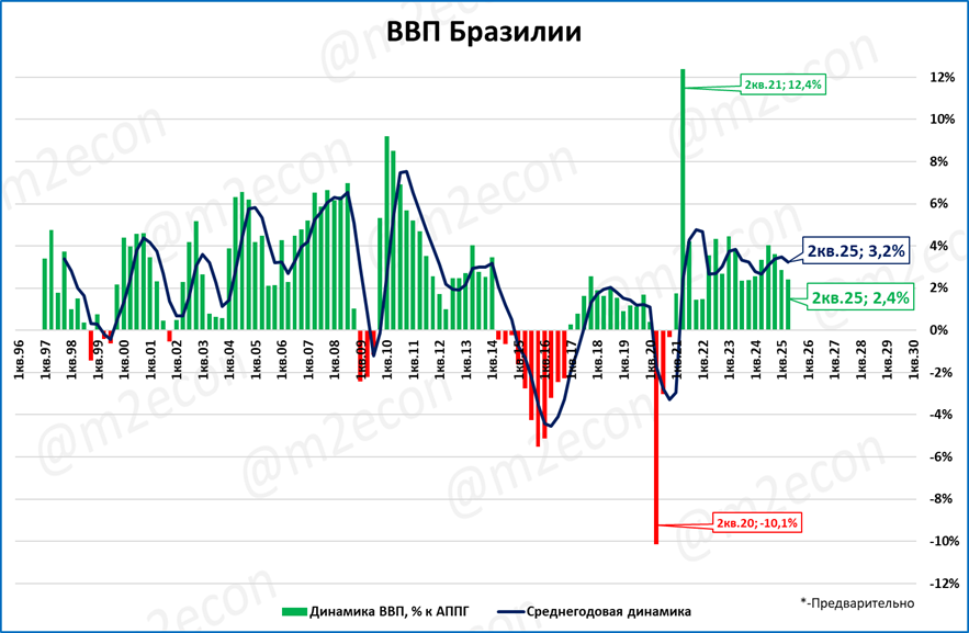 ВВП Бразилии во 2 квартале вырос на 2,4% по первым, предварительным оценкам.