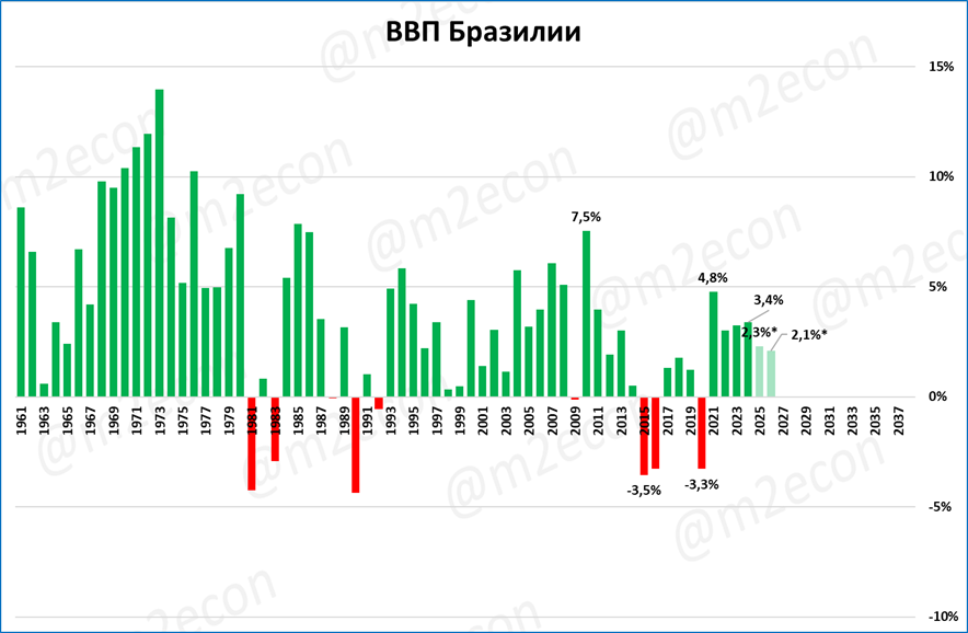 Прогноз МВФ предполагает рост ВВП Бразилии в 2025 году на 2,3%.