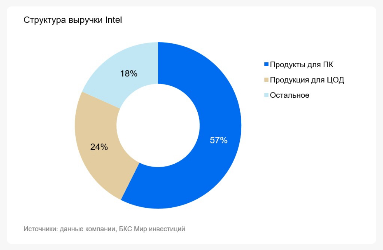 Intel (NASD: INTC) разрабатывает и производит микросхемы (чипы) для персональных компьютеров (>50% выручки), дата-центров (более трети выручки) и беспилотных автомобилей. Intel как крупнейший производитель чипов в США продает товары и услуги на $54 млрд в год. В отличие от главного конкурента AMD, Intel владеет заводами по производству микросхем. Ежегодно компания продает около 180 млн центральных процессоров (>70% рынка центральных процессоров). Среди крупнейших потребителей продукции — производители ПК (DELL, Lenovo, HP). У Intel широкий географический охват клиентов: доля Китая в структуре выручи составляет 27%, США — 26%, Сингапура — 16%, Тайваня — 13%.