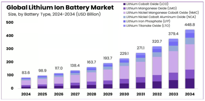 Рынок литий-ионных аккумуляторов. Основной фокус TTI — инновационные беспроводные решения на базе литий-ионных батарей, которые обеспечивают компании лидерство в сегменте профессиональных и бытовых инструментов. По данным MarketUS, объем мирового рынка литий-ионных аккумуляторов составит около $448,8 млрд к 2034 году по сравнению с $83,6 млрд в 2024 году. Среднегодовой темп роста в прогнозируемый период — 18,3%.