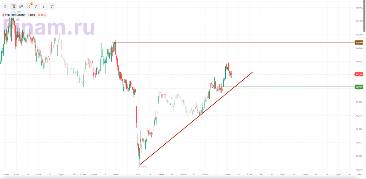 На дневном таймфрейме акции компании движутся в восходящем тренде к уровню сопротивления HKD 112,09. Однако сейчас возможна коррекция и ретест наклонной линии от начала апреля в зоне HKD 95.