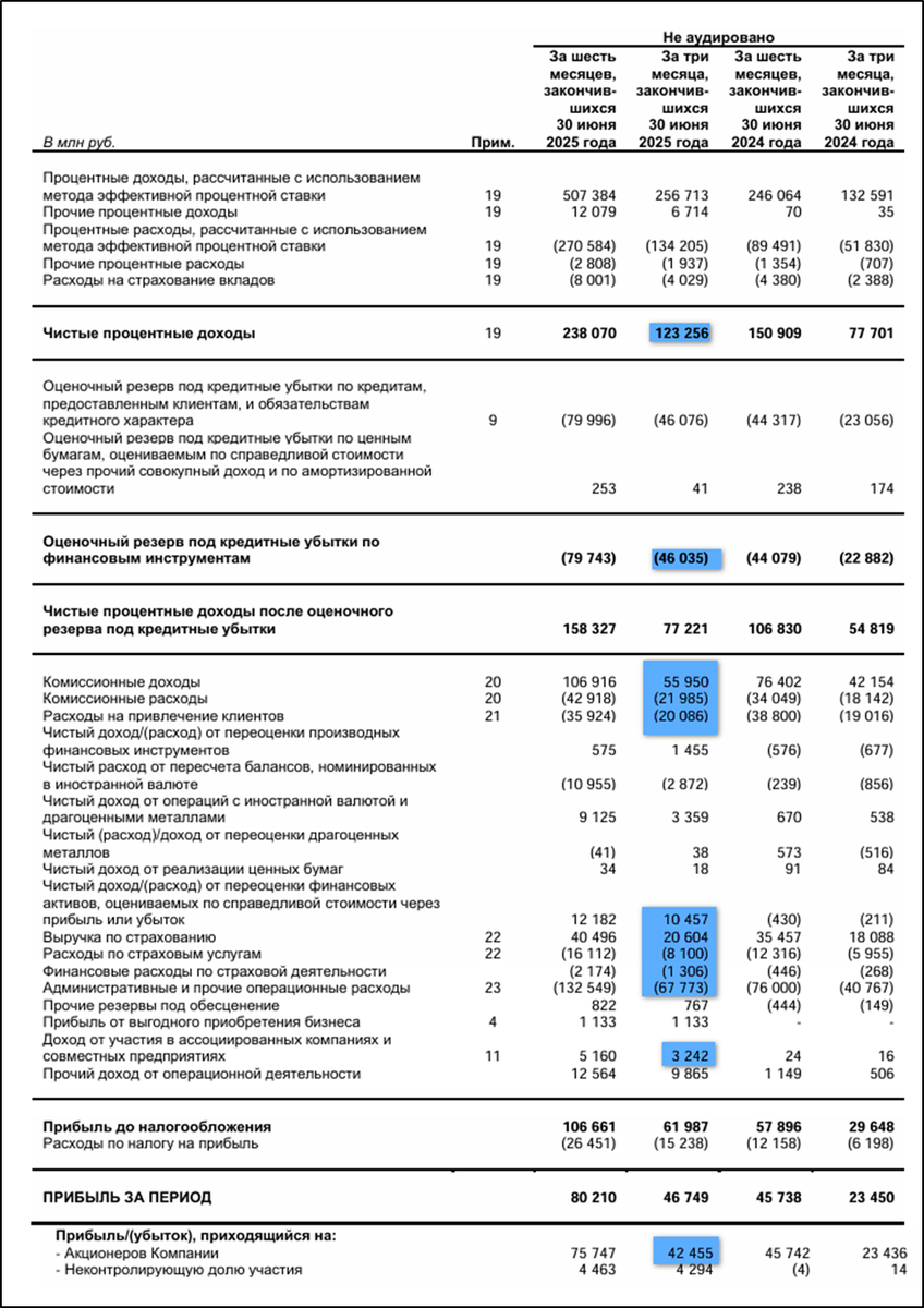 В прошлом году Группа присоединила РОСБАНК, посредством доп эмиссии. Количество акций в обращении увеличилось на 35%. В том числе благодаря этому присоединению, операционные и финансовые результаты сильно подросли. В 2Q 2025 ЧОД и ЧП рекордные, но кв/кв видим замедление темпов роста. Баланс также отражает замедление темпов роста бизнеса.